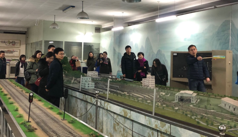交流会前,运输系党支部书记陈军华、副系主任黎浩东带领人民铁道报社编辑中心一行参观了运输设备教学馆和交通运输国家级虚拟仿真实验教学中心。