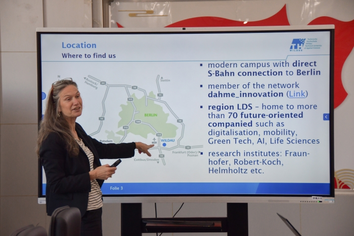北京交通大学国际合作交流处副处长谭宇燕介绍了北京交通大学办学特色、学科建设、人才培养、国际交流等方面的情况。她指出,学校高度重视国际交流工作,积极推进教育国际化,今年国际处启动了多个师生交流项目。她非常期待与德国维尔道应用科学大学合作,共同促进两校师生双向流动。