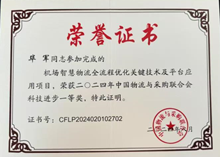 [7] 中国物流与采购联和会一等奖. 机场智慧物流全流程优化关键技术及平台应用. 2024.8, 排2/10。