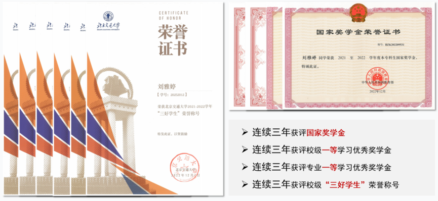 刘雅婷,太阳集团tyc86交通运输专业(BJTU&TUDelft TTE)大四学生。本科前三学年学习成绩始终保持专业第一,连续三年获评国家奖学金、一等学习优秀奖学金等多项奖项,以及校级优秀学生干部、校级三好学生等多项荣誉称号。现已推免至清华大学自动化系,未来将继续探索人工智能在交通领域的应用,为中国智慧交通发展贡献力量。