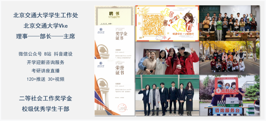 三年以来,刘雅婷始终在北京交通大学Vke任职,为交大新媒体建设贡献力量。从理事,到部长,到主席,她负责学工处官方公众号、B站、抖音等平台的运营,协助学工处开展各类工作,获评二等社会工作奖学金和校级优秀学生干部。但是对她而言,学生工作带给她最大的收获是一群志同道合的朋友。他们会在例会上一起提出天马行空的巧思妙想,一起筹备大型活动,去采风,去拍摄,为了更好地服务交大师生建言献策,来自不同专业、不同年级的他们在这里组成了一个完整的家庭。