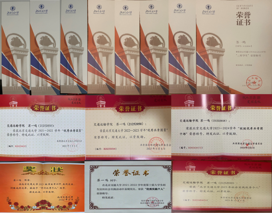 出身于铁路家庭的苏一鸣,自幼在铁道旁边长大,“火车”、“铁路”等词对他有着独特的意义。在高考后,他选择报考了交通运输专业,立志为祖国轨道交通事业贡献自己的力量!在大学的三年时光里,他一步一个脚印,每一堂课都全神贯注,每一次作业都力求完美,每日都致力于攻克自己知识上的盲点。诚然,人无完人,对数学、计算机和铁路专业课有足够自信的他,在道路交通方向专业课遭遇了不小的挑战。面对这些自己不擅长的课程时,他也从未退缩,而是更加勤勉地投入学习,不惜花费更多的时间与精力,虚心向师长同学求教,不断弥补自己的不足。本科期间,33门课程满绩、三次获得学习奖学金、两次获得三好学生荣誉称号是对他努力最好的答卷。他坚信:“人生没有白走的路,每一步都算数!”