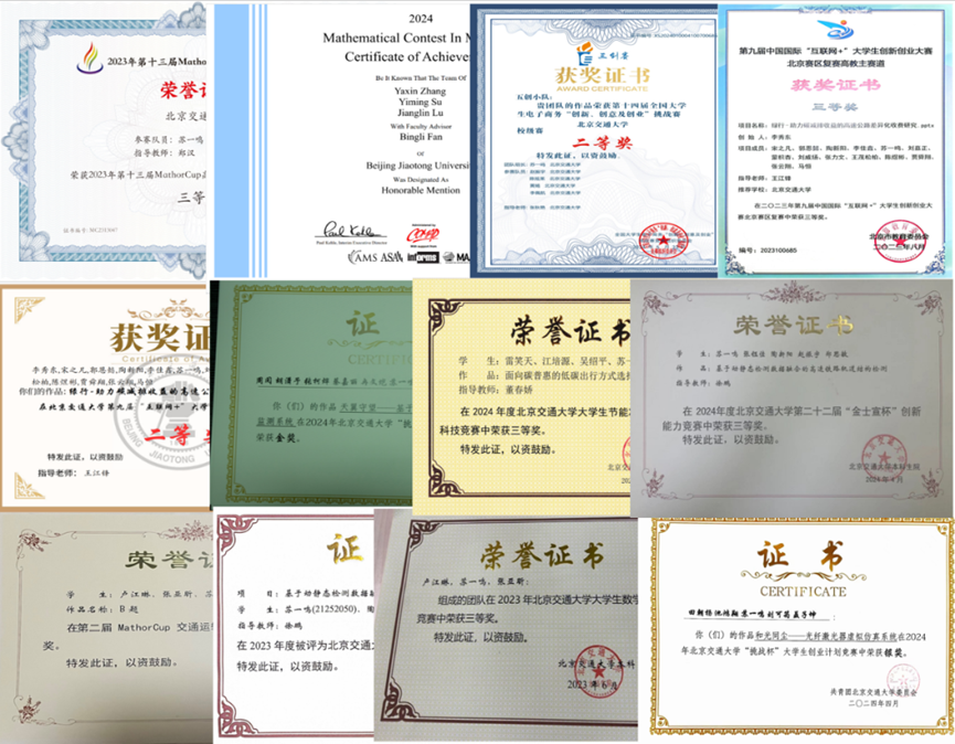在日常学习的同时,苏一鸣还积极投身于各类科研竞赛之中,凭借自身不懈的努力,收获了丰硕的成果。他荣获了Mathorcup数学建模挑战赛国赛三等奖、美国大学生数学建模竞赛H奖,以及“互联网+”市赛三等奖等多项荣誉。在前三学年中,他累计获得了国家级竞赛奖项2项、市级奖项1项、校级奖项10项。 每一次参与竞赛,都是对自身专业能力的一次锤炼与提升,同时也是对他领导力、沟通力以及团队协作能力等综合素质的全面展现与增强。他深知,竞赛不仅是检验知识的试金石,更是锻炼自我、超越自我的绝佳机会。因此,他始终保持着对科研竞赛的热情与执着,不断挑战自我,追求卓越。