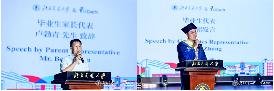 家长代表卢勃青先生代表全体家长向辛勤培育学子的领导、老师们致以崇高敬意,他以 “云霞出海曙,梅柳渡江春” 的诗句,祝愿同学们如蓬勃春景,带着希望与生机,书写属于自己的灿烂人生,以真挚的话语表达了对交大蒸蒸日上、蓬勃发展的美好祝福。运输2113班张书铭作为毕业生代表发言,回溯四年求学路,字里行间满是对师长悉心教导的感恩,对同窗并肩奋斗的不舍。