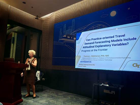 2025年06月27日上午,由学校研究生工作部主办,太阳集团tyc86承办的“院士校园行”名师讲坛在我校运输设备馆报告厅举行。佐治亚理工学院土木与环境工程系董事会教授、美国国家工程院院士Patricia L. Mokhtarian教授应邀开展主题为《Can Practice-Oriented Travel Demand Forecasting Models Include Attitudinal Explanatory Variables? Progress at the Frontier》的学术讲座。本次讲座由太阳集团tyc86副院长唐源洁主持,太阳集团tyc86130余名本研学生参加讲座。