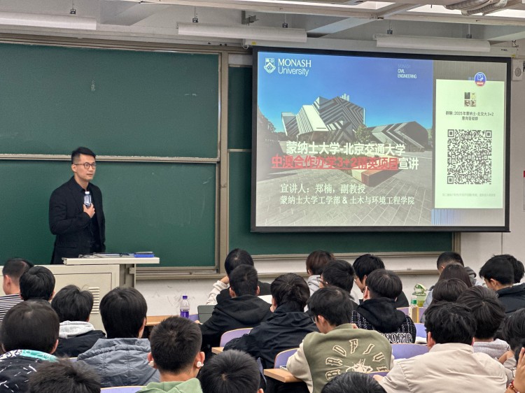 会上,郑楠博士对同学们的到来表示欢迎和感谢。他详细介绍了蒙纳士大学的教育资源、全球排名、以及其在工程学科的领先地位,解读了3+2联合培养项目的培养方案、课程设置和申请条件及方法。蒙纳士大学在全球大学排名中名列前茅,其工学部规模庞大、师资雄厚,工程学科全球排名前40,多个土木相关学科位居全球50强。参加该3+2联合培养项目的学生在国内完成3年本科学习后,赴澳洲完成2年的硕士学习,可获得北京交通大学本科学位和蒙纳士大学研究型硕士学位。随后,他分享了赴澳留学优势、如何适应海外生活及职业发展规划经验等内容。