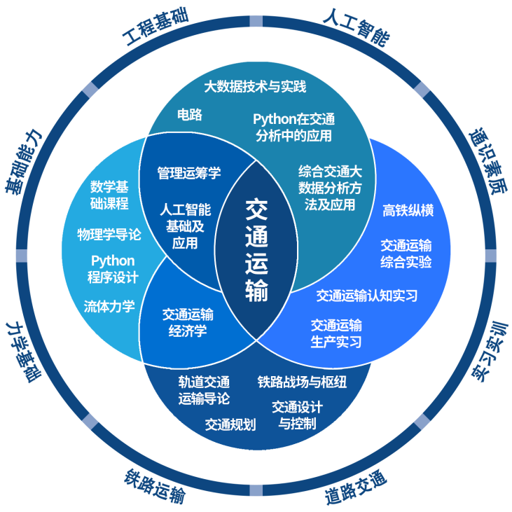 以交通运输为核心,融合通识素养、工程基础、人工智能等多维能力培养方向,构建覆盖“基础能力—专业素养—工程实践”的课程体系,强化道路交通与铁路运输两大领域的综合分析与实践训练,贯穿中英文教学与国际化学习环节,全面提升学生的数理基础、编程能力、智能交通素养、工程实践能力以及跨文化沟通能力,实现交通运输领域国际化卓越人才培养。
