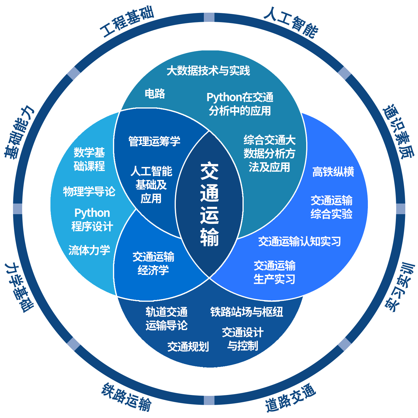 以交通运输为核心,融合通识素养、工程基础、人工智能等多维能力培养方向,构建覆盖“基础能力—专业素养—工程实践”的课程体系,强化道路交通与铁路运输两大领域的综合分析与实践训练,贯穿中英文教学与国际化学习环节,全面提升学生的数理基础、编程能力、智能交通素养、工程实践能力以及跨文化沟通能力,实现交通运输领域国际化卓越人才培养。